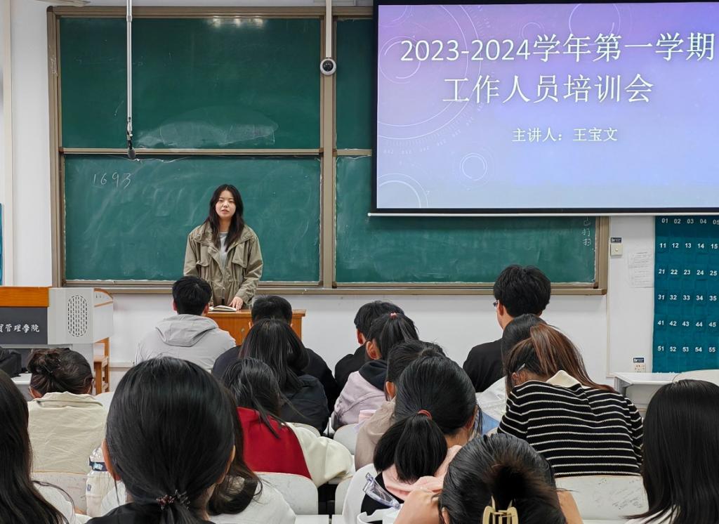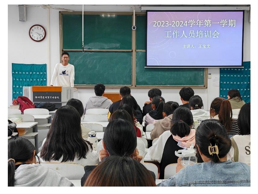为推进基础部后续工作的展开,更好地增强相关人员的管理意识,基础部全体团学组织成员及班委于2023年10月27日下午四点在综合大楼220教室开展2023-2024学年第一学期基础部团学组织工作人员培训会,本次会议由辅导员李明明老师主持。