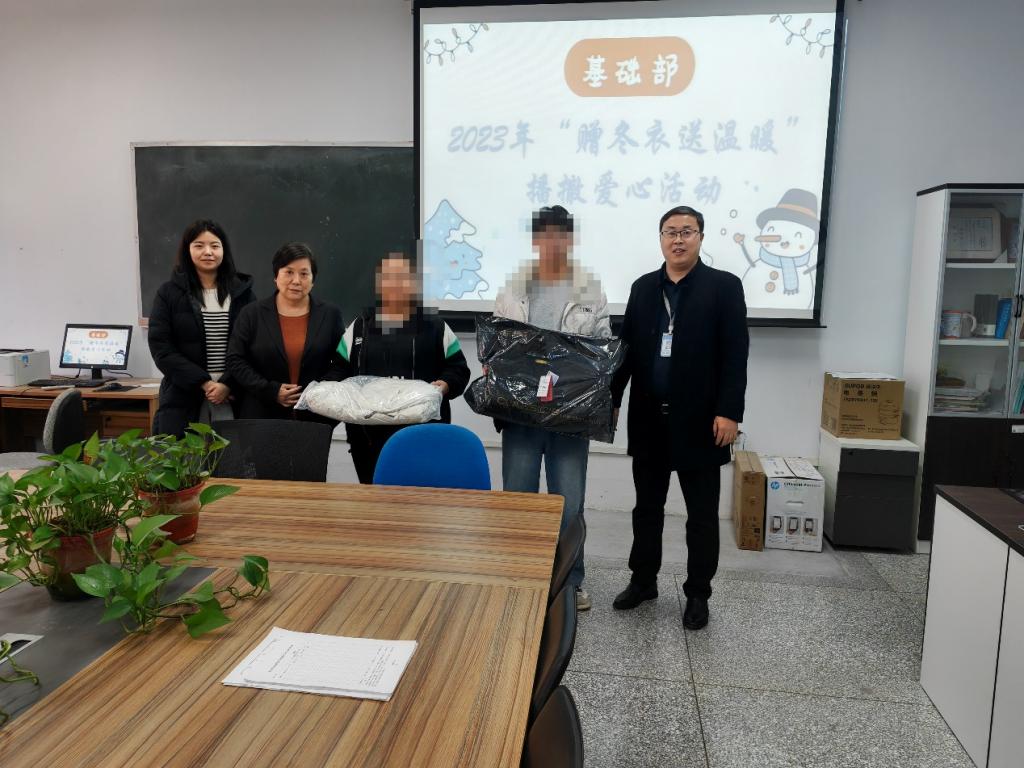 爱洒寒冬,暖衣助学。为了弘扬创办人“关心、爱心、耐心”的爱生精神,营造温暖、友爱的校园文化,基础部于12月7日中午12点在综合楼115教室开展“赠冬衣送温暖”播撒爱心活动,基础部主任王莉莉、党总支书记张志银和辅导员李明明参加了本次活动。