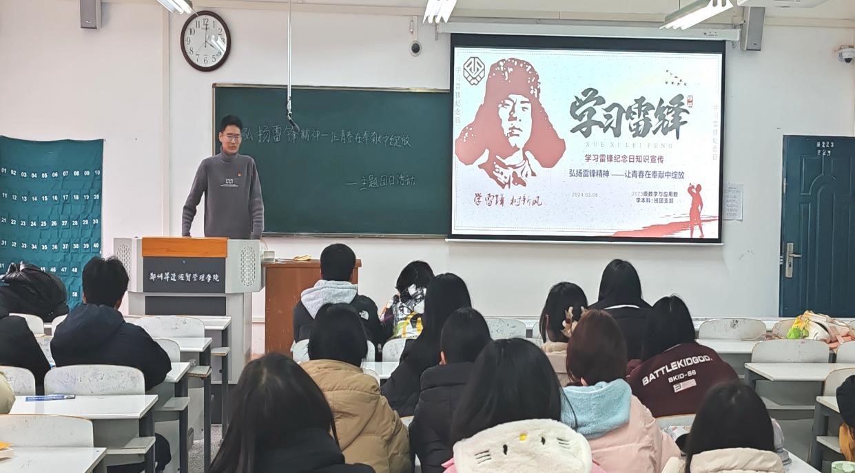 为学习贯彻习近平总书记关于弘扬雷锋精神的一系列重要论述,让学雷锋活动融入日常、化作经常,让雷锋精神在新时代绽放更加璀璨的光芒。基础部数学与应用数学专业全体团员及有志青年于3月6日在综合楼223教室召开传承雷锋精神主题团日活动。