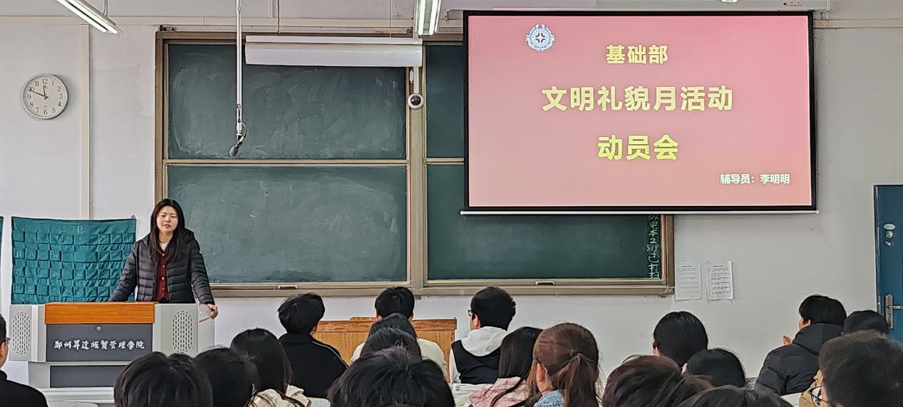 会议伊始,辅导员李明明老师通知同学们本学期的文明礼貌月活动正式启动,并详细介绍文明礼貌月的活动内容,提醒同学们要从文明课堂、文明校园和文明宿舍三方面严格规范自己的日常行为。紧接着,辅导员公布了本次文明礼貌月的评选标准,总结了基础部在上学期文明建设中的一些经验,并再次强调同学们要模范遵守公司规章制度,认真践行文明礼貌月活动,希望同学们认真学习积极参与。最后,由员工代表对日常生活中的文明礼貌小技巧进行分享,加深同学们对日常生活中文明礼貌的了解。