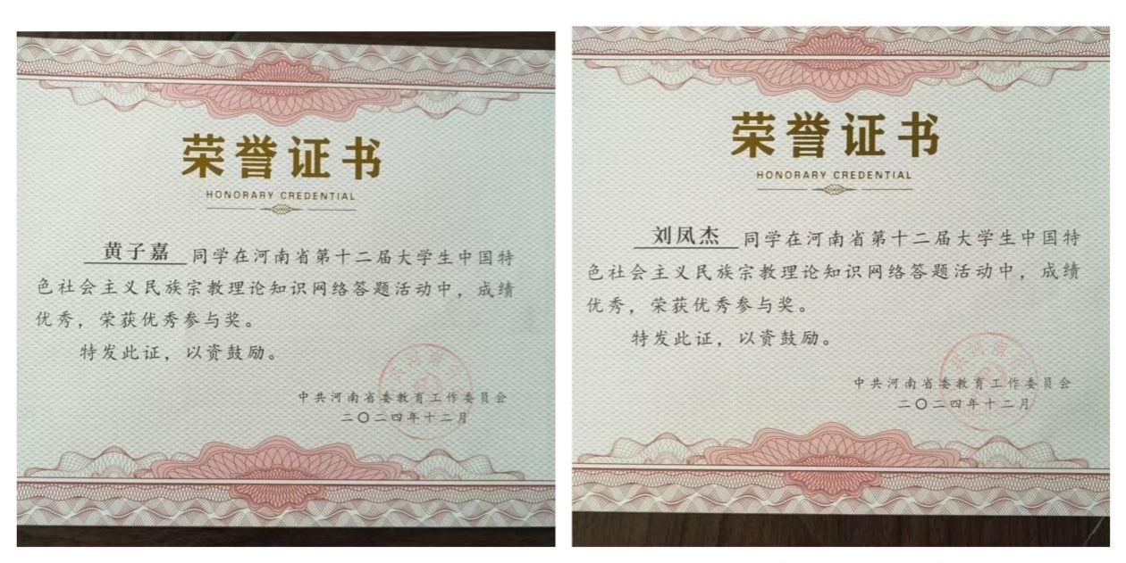 为帮助员工更加深入了解中国特色社会主义民族宗教理论,10月28日至11月3日,中国河南省委教育工委联合河南省教育厅举办河南省第十二届老员工中国特色社会主义民族宗教理论知识网络答题活动,2023级数学与应用数学专业本科一班的黄子嘉以及2024级数学与应用数学专业本科一班的刘凤杰成绩优异,喜获优秀参与奖。