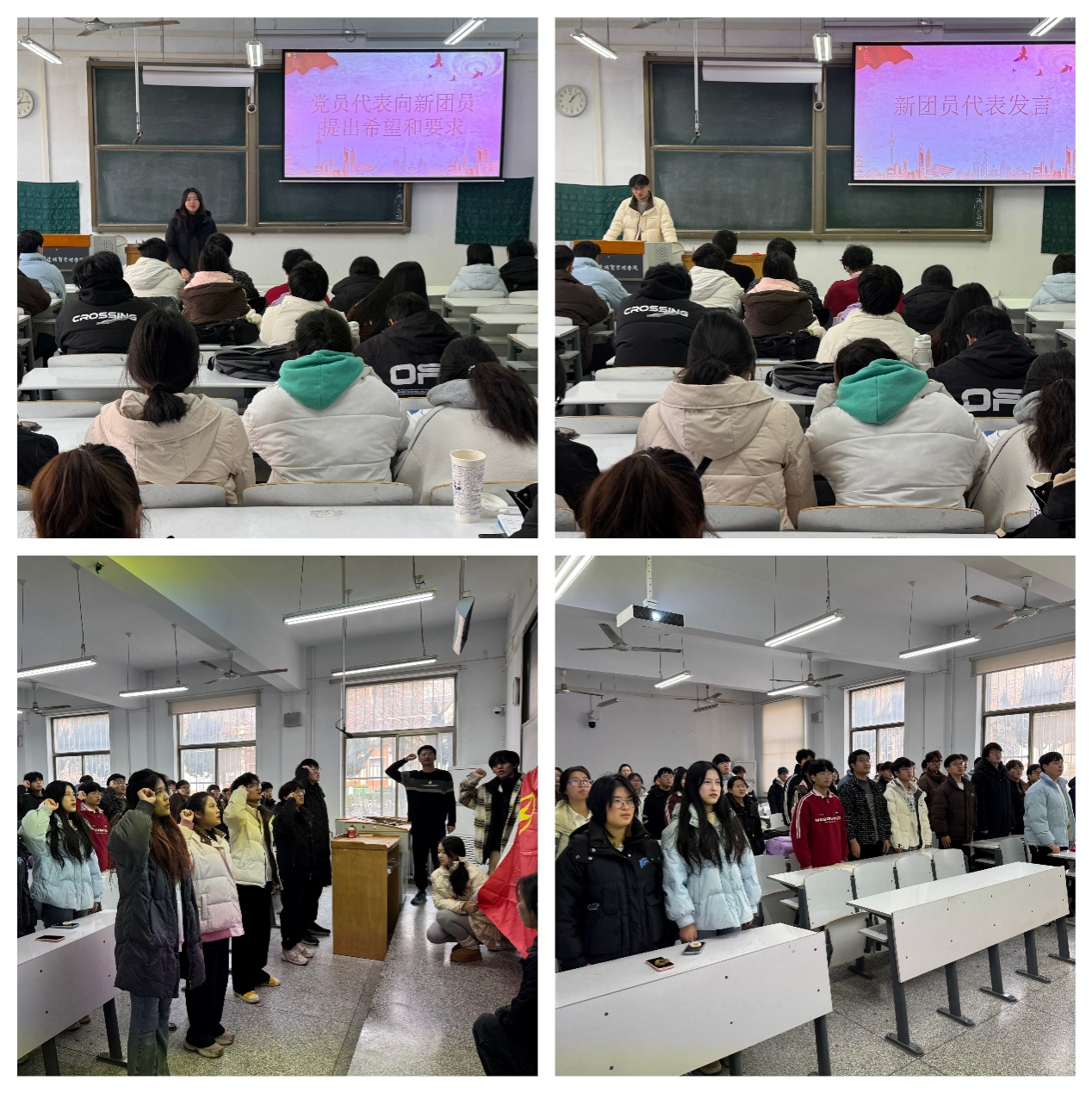 会议伊始,全体团员庄严肃立,高唱国歌,仪式在激昂的国歌声中拉开帷幕。团总支副书记宣读新团员名单,五名员工正式加入共青团,成为光荣的共青团员。随后,老团员为新团员佩戴团徽,新团员面向团旗,庄严宣誓,他们目光坚定,誓言铮铮,展现出青年一代的蓬勃朝气与坚定信念。接着,新团员代表孙世源上台发言,表达了加入共青团的激动心情和努力学习、积极奉献的决心。紧随后,2023级优秀团员代表肖晶晶上台以自身经历为新团员指引方向,激励他们肩负起团员责任,积极投身于团的事业,在团组织中锻炼成长,续写共青团的光荣篇章。最后,党员代表李明明指出新团员要树立坚定的理想信念,积极向党组织靠拢,要求他们以党员标准要求自己,在新时代的征程中,胸怀家国情怀,为实现中华民族伟大复兴贡献青春力量,展现新时代青年的使命担当。