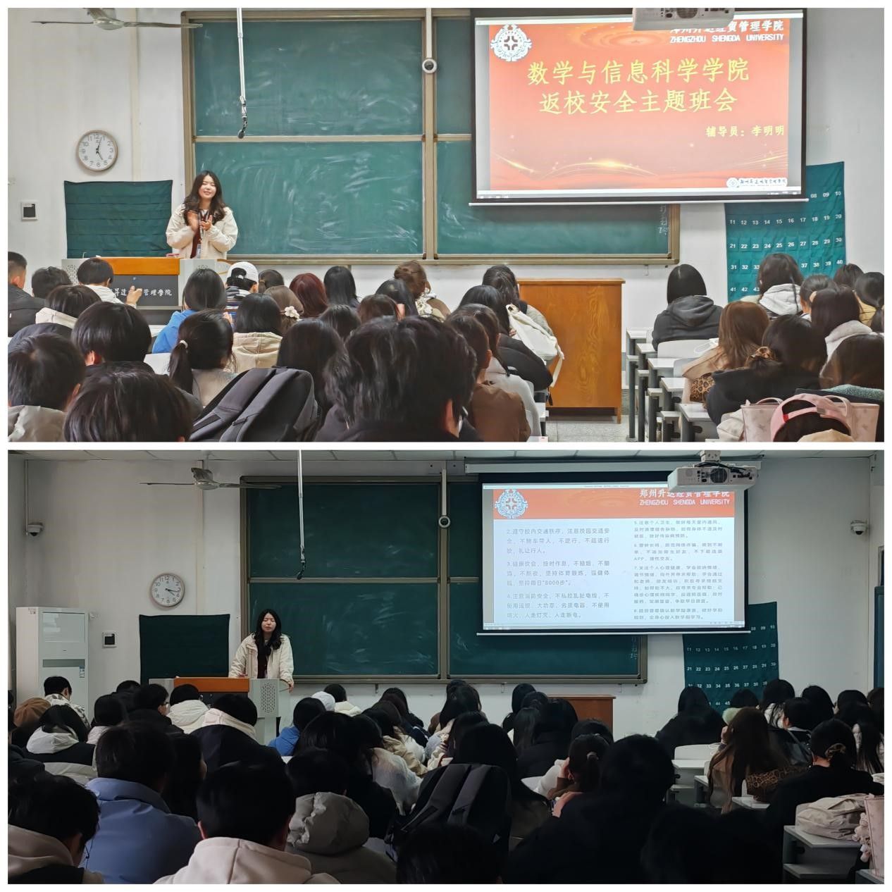 会议伊始,辅导员李明明引导全体员工养成良好的生活作息,坚持每天完成8000步的运动计划。接着,在校园交通安全方面,辅导员李明明着重强调员工禁止骑电动车载人,安全行驶,做到不超速、不逆行。随后,在防范网络诈骗方面,辅导员李明明详细剖析“刷单返利”“冒充亲友”“游戏充值”等常见诈骗手段,告诫全体员工需提高警惕,切实守护好自己的财产安全。最后,辅导员李明明鼓励员工们积极参与校园安全管理,一旦发现安全隐患,要及时上报,共同为营造安全、和谐、有序的校园环境贡献力量。
