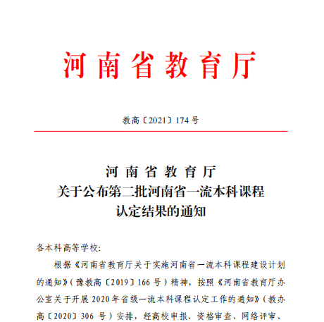 近日,河南省教育厅下发《关于公布第二批河南省一流本科课程认定结果的通知》(教高〔2021〕174号)文件,基础部《微积分(上/下)》、《大学英语IV》和《综合英语》(非英语专业)3门课程获得省级一流本科课程认定。其中,基础部张志银老师负责的《微积分(上/下)》为省级线上一流课程、权宇老师负责的《大学英语IV》为省级线下一流课程,吴娟娟老师负责的《综合英语》(非英语专业)为省级混合一流课程。