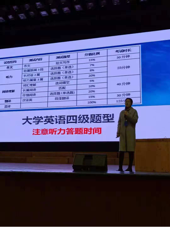此次讲座让同学们了解了四级考试的形式流程、注意事项、方法技巧以及解题策略,为我校备战四六级的同学指明了学习方向,从而使同学们可以更有针对性的进行考前复习,同时也增强了大家通过考试的信心。