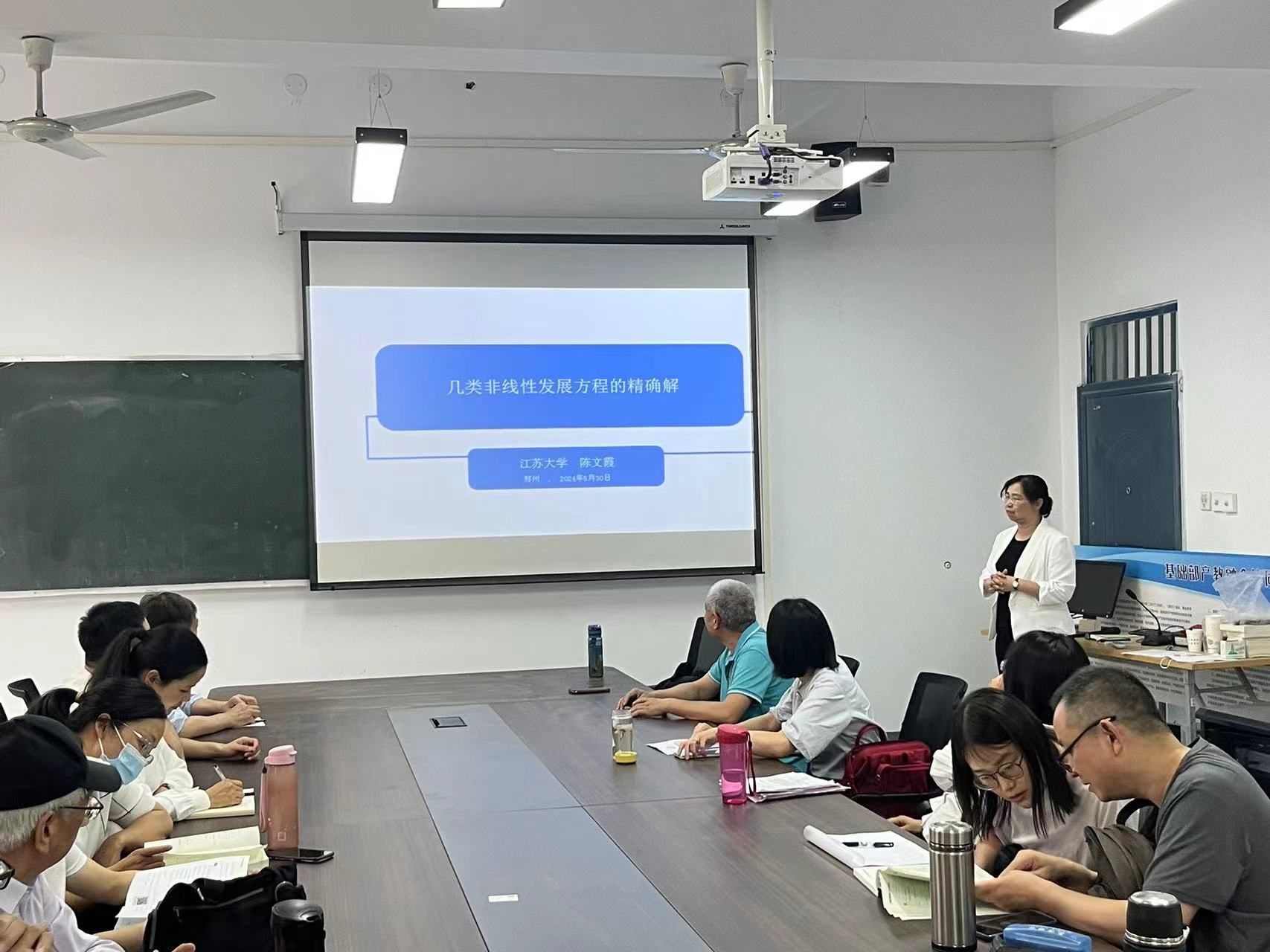 陈教授报告题目为《几类非线性发展方程的精确解》,在报告中陈教授从研究意义、相关理论及研究成果等三个方面对非线性发展方程的孤子理论进行了深入系统阐述。讲座内容丰富精彩,既有传统理念阐述,又有前沿最新研究内容和成果,让在座教师领略到了当前该领域最前沿的研究方向,深受启发,受益匪浅。