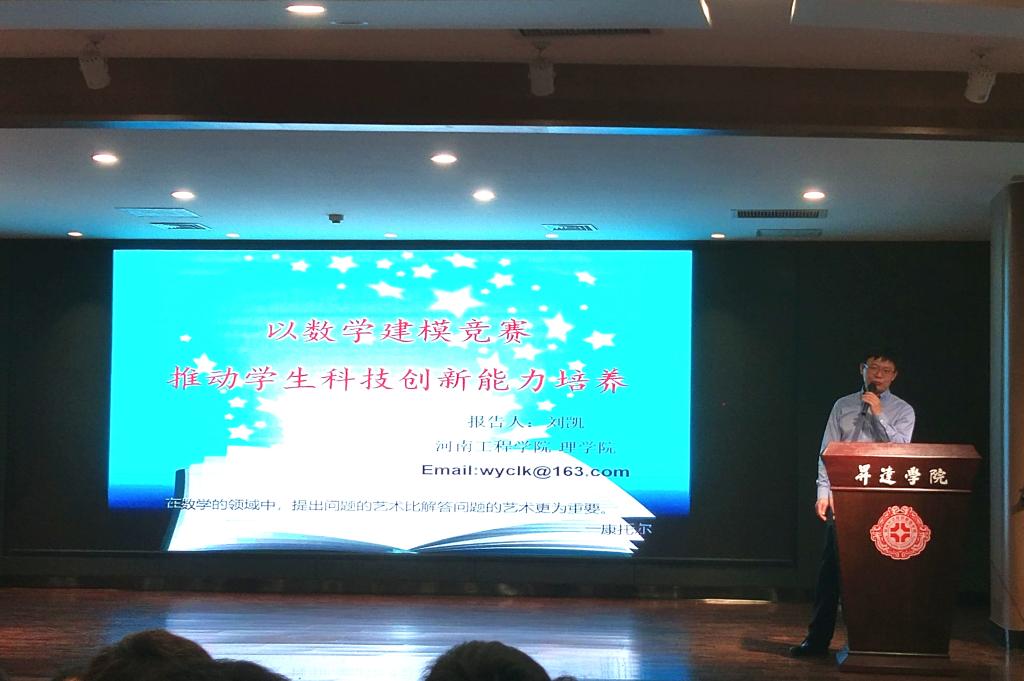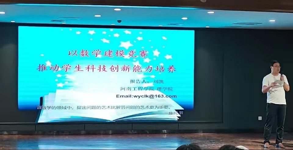 接着,刘凯老师引用康托尔的话——在数学的领域中,提出问题的艺术比解答问题的艺术更为重要。引发同学们的深思并随之进入会议主题。其次,刘凯老师从简单数学模型举例、科技创新能力培养、河南工程公司数学建模工作现状、数学建模竞赛准备、其他内容介绍这五个方面进行了经验分享。