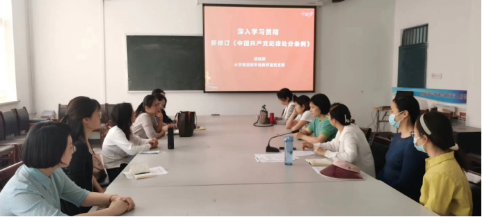为深入学习贯彻修订后的《中国共产党纪律处分条例》,根据公司党委的安排部署,2024年4月18日,在综合楼基础部会议室,基础部大学英语视听说教研室党支部召开专题会议,学习贯彻新修订的《中国共产党纪律处分条例》。党支部书记宋玮同志主持会议,支部全体党员教师参加了会议。