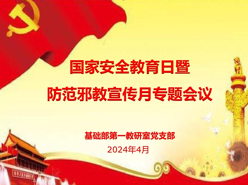 4月15日,是我国第九个“全民国家安全教育日”,为提高教师们的国家安全意识,激发大家的国家安全的责任感和使命感。基础部第一教研室党支部于4月11日召开了“国家安全教育日暨防范邪教宣传月专题会议”,会议的主题为:“树牢国家安全观,崇尚科学树新风”。会议由党支部书记权宇副教授主持,全体党员教师参加了会议。