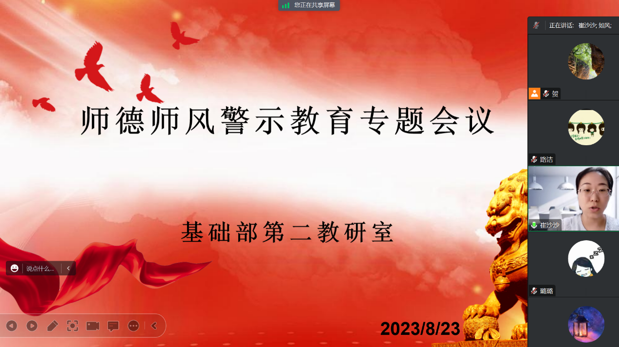 2023年8月23日晚,基础部第二教研室召开了师德师风警示教育专题会议,教研室全体教师参加了此次会议,会议由教研室主任贺光辉老师主持。