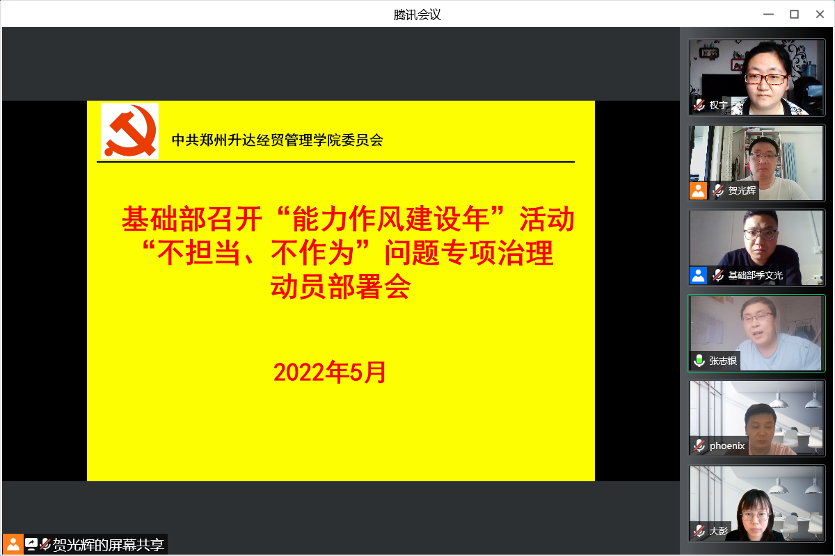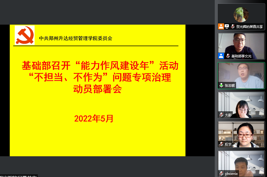 5月22日,下午14:00-15:00,基础部通过腾讯会议召开“能力作风建设年”活动“不担当、不作为”问题专项整治动员部署会,基础部党总支委员和各教研室党支部书记参加了会议,会议由张志银书记主持。