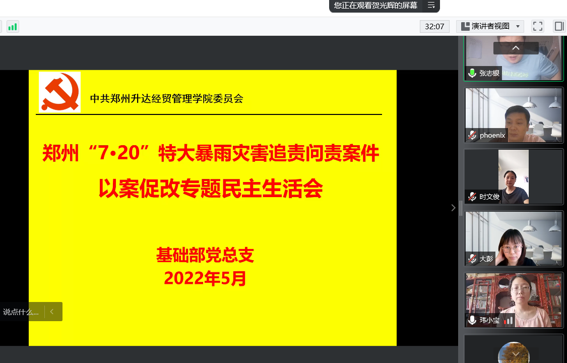 5月22日下午,基础部党总支中心组通过腾讯会议召开了“7·20”特大暴雨灾害追责问责案件以案促改专题民主生活会,会议由党总支书记张志银同志主持,党总支委员以及各党支部书记参加了会议。