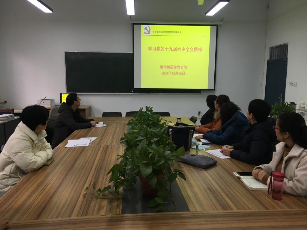 12月16日下午,基础部数学教研室党支部在综合楼115集中学习十九届六中全会精神。党总支委员王森源同志主持会议,总支书记张志银同志及数学教研室党支部全体党员参加了此次学习。