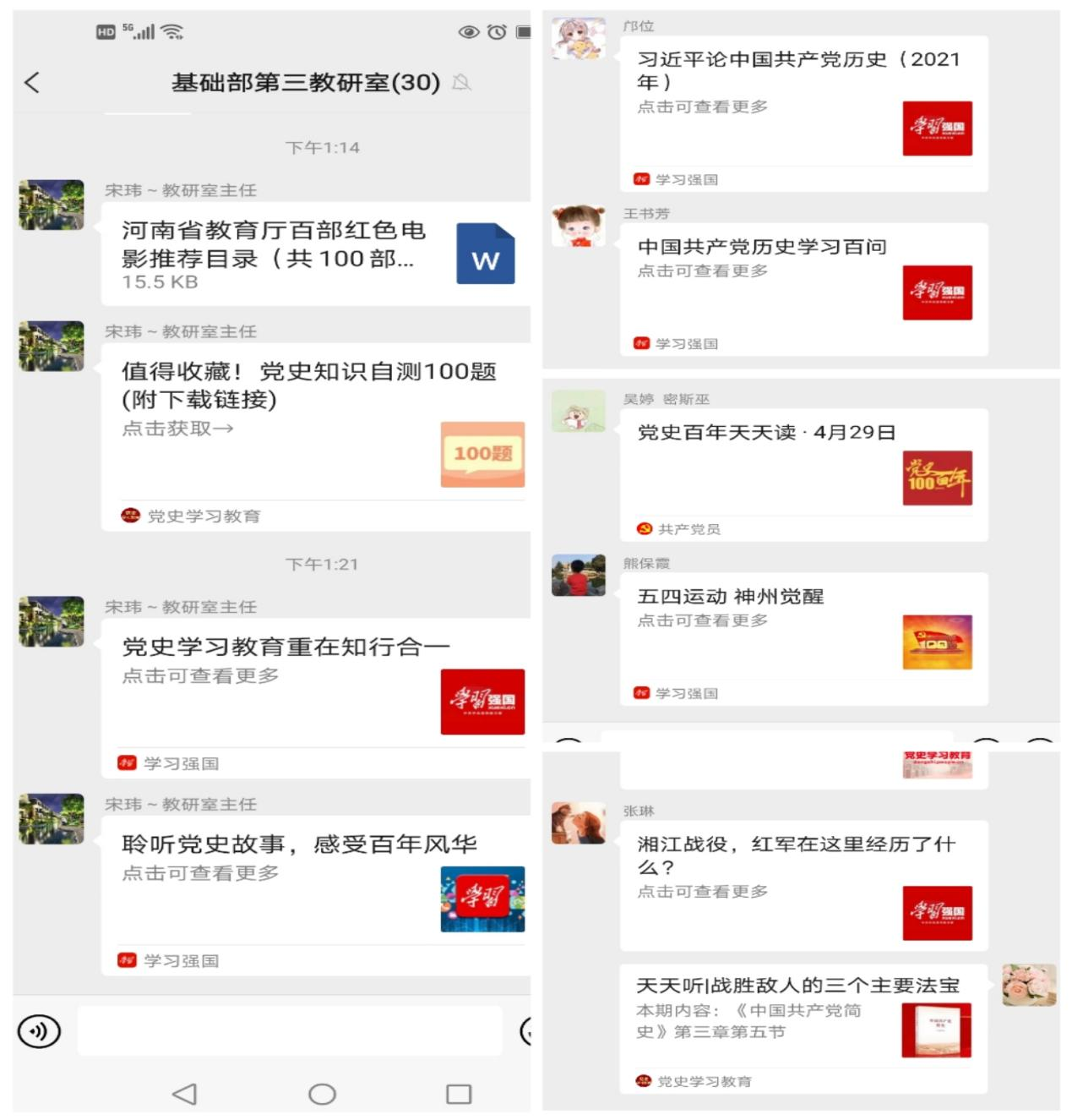 本次会议共分为三项议程。第一项议程:参会的全体成员在基础部第三党小组组长宋玮同志带领下共同学习了“党史学习教育重在知行合一”。第二项议程:第三党小组组长宋玮同志结合《基础部直属党支部关于开展“党史学习教育”的实施方案》具体布置了第三党小组的党史学习工作,分享了《党史知识自测100题》,号召同志们为基础部的“学四史、守初心”知识抢答活动做好充分准备。第三项议程:第三党小组组长宋玮同志分享了《河南省教育厅百部红色电影推荐目录(共100部)》,号召全体参会人员在“党史学习教育”中,边学习边分享,同时带动家人和孩子一起学习党史,一起观看红色革命电影。