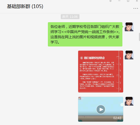 基础部通过基础部微信工作群,对《条例》内容进行宣传解读。统战专员王森源同志通过查找网络资源,将图片资源-新修订的《中国共产党统一战线工作条例》要点速览,视频资源-观当下《中国共产党统一战线工作条例》及华声晨报出品的解读《中国共产党统一战线工作条例》统战知识微课堂等图片、视频资源分别推送到了党员群和基础部工作群中,使广大教师能更加容易吸收统战知识。广大教师通过学习,熟悉了《条例》颁布的背景意义,统战工作领域范围,统战工作的原则。