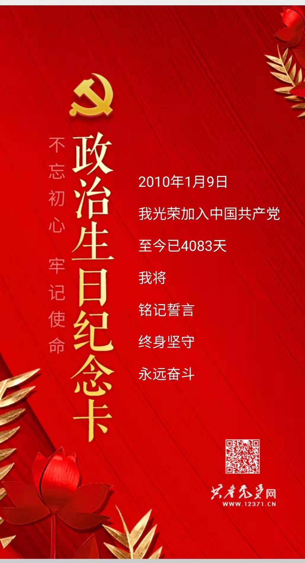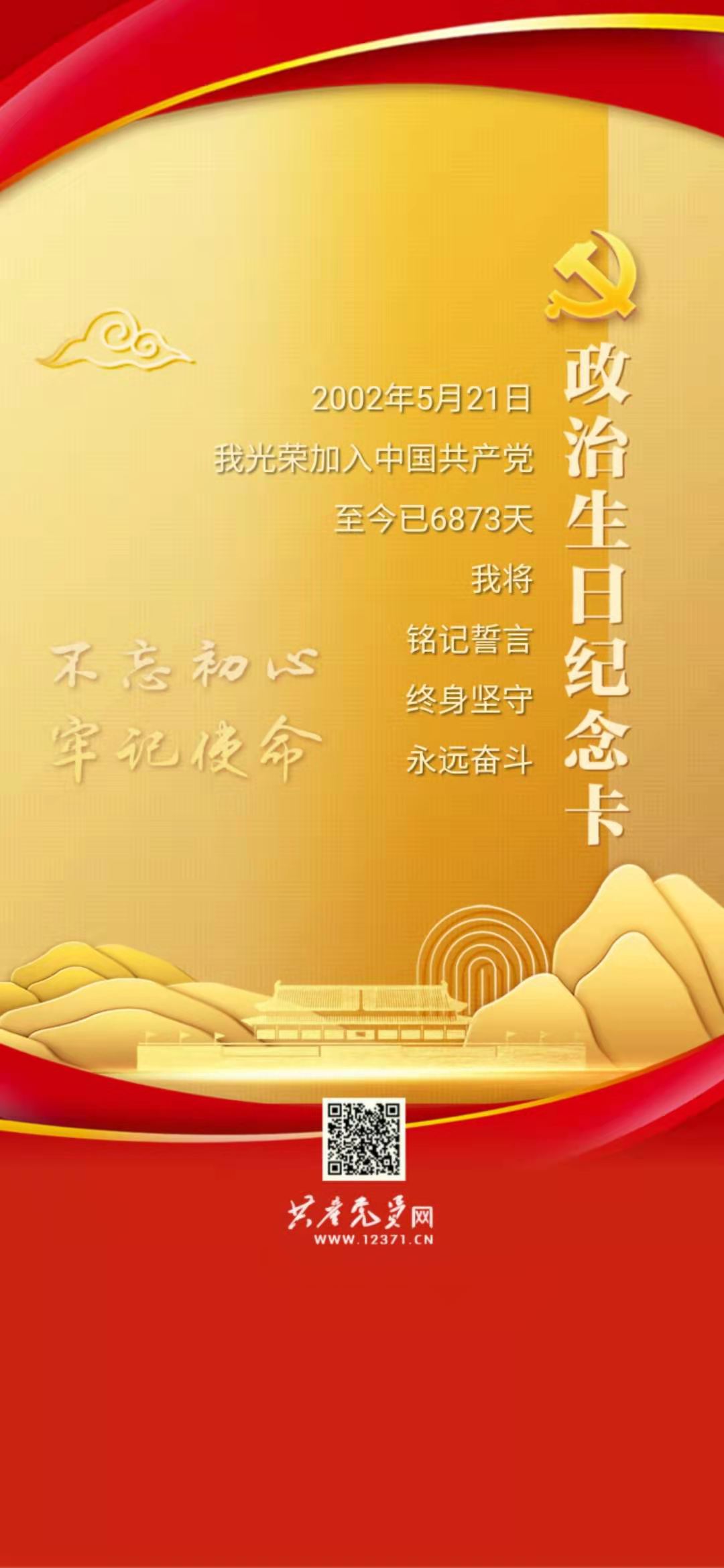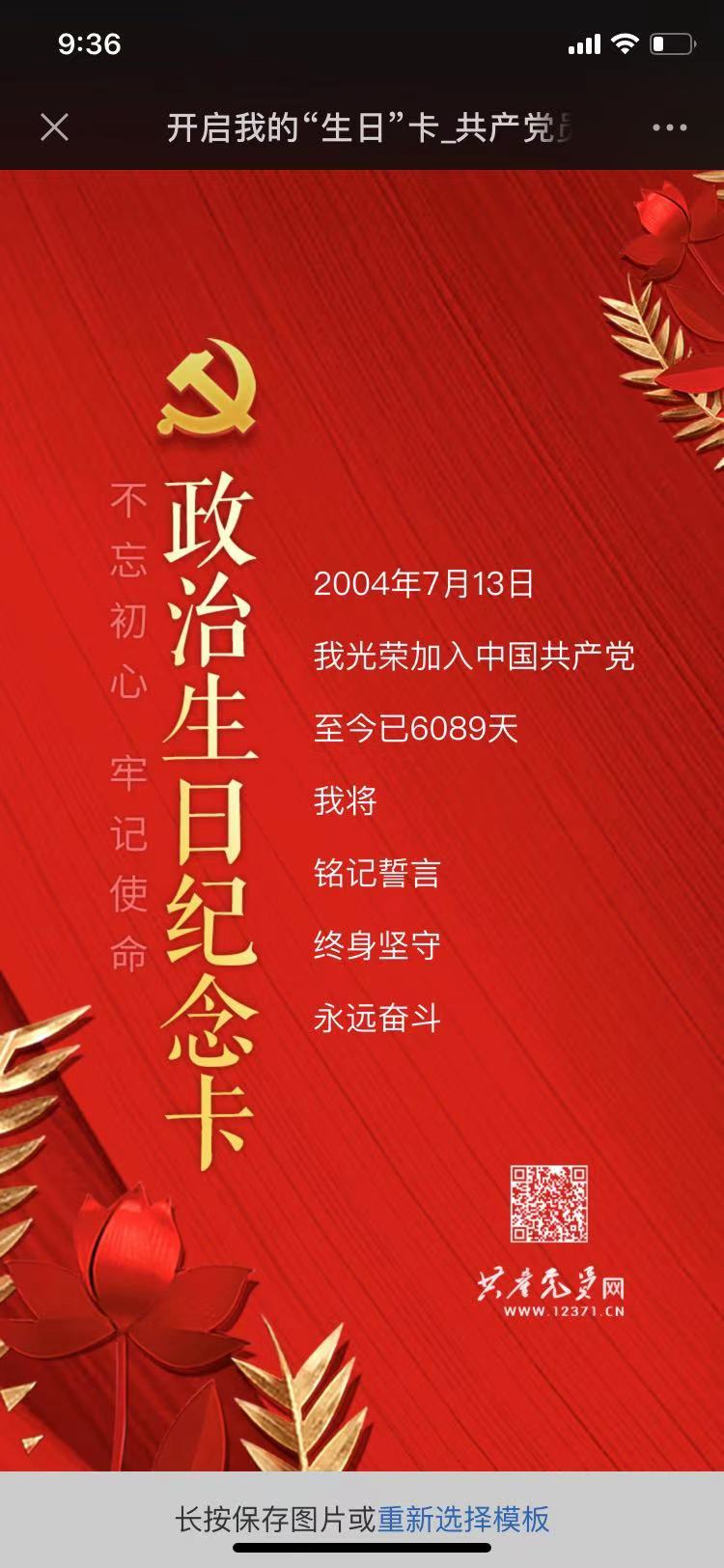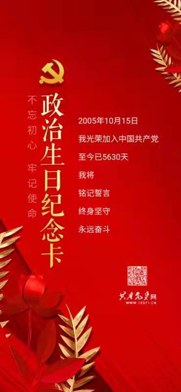 今年是中国共产党成立100周年,为庆祝建党100周年,迎接党的生日到来。基础部直属党支部开展了“党员政治生日纪念卡”主题活动。书记张志银同志将电子“政治生日卡”发送到党支部微信群中,各位党员同志填写了自己的政治生日纪念卡,卡上包含了入党誓词、党员的政治生日即入党日,以及入党年限等内容。党员同志收到“政治生日卡”后,纷纷表示惊喜和感动,认为举行这样特别的主题活动,让党员同志重温了入党记忆,十分有意义。