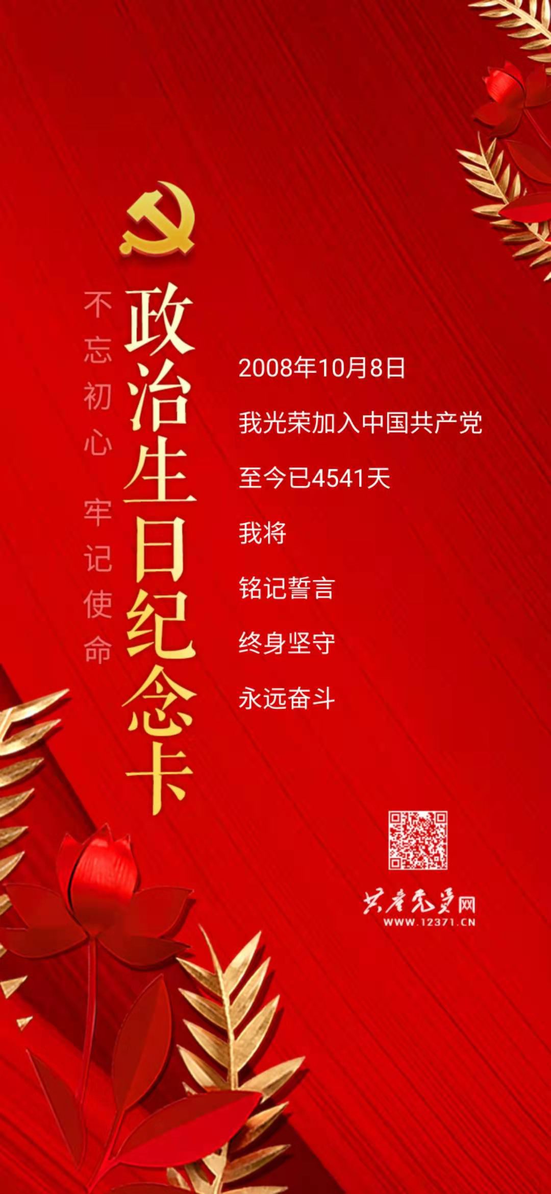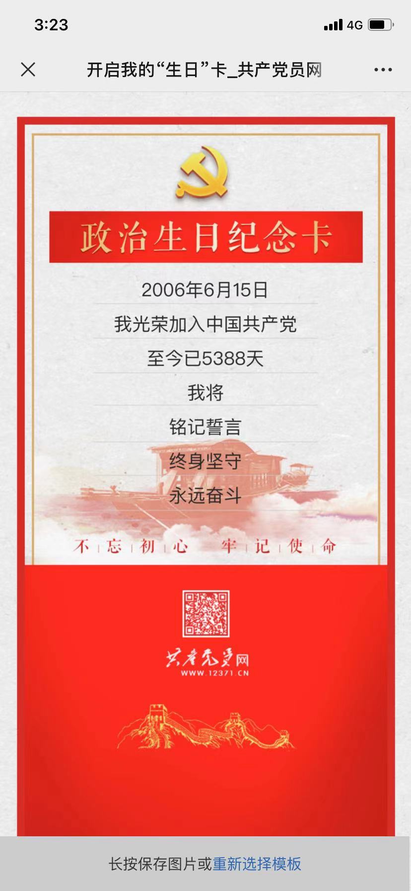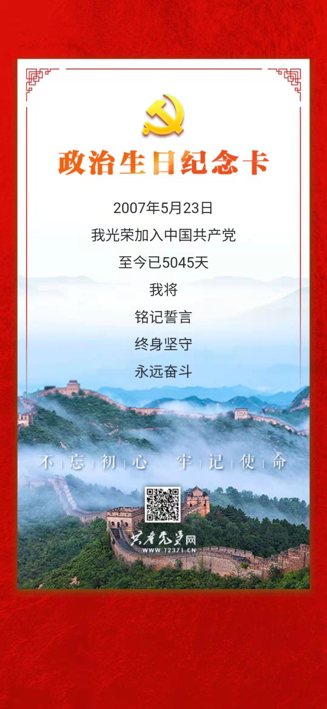 今年是中国共产党成立100周年,为庆祝建党100周年,迎接党的生日到来。基础部直属党支部开展了“党员政治生日纪念卡”主题活动。书记张志银同志将电子“政治生日卡”发送到党支部微信群中,各位党员同志填写了自己的政治生日纪念卡,卡上包含了入党誓词、党员的政治生日即入党日,以及入党年限等内容。党员同志收到“政治生日卡”后,纷纷表示惊喜和感动,认为举行这样特别的主题活动,让党员同志重温了入党记忆,十分有意义。