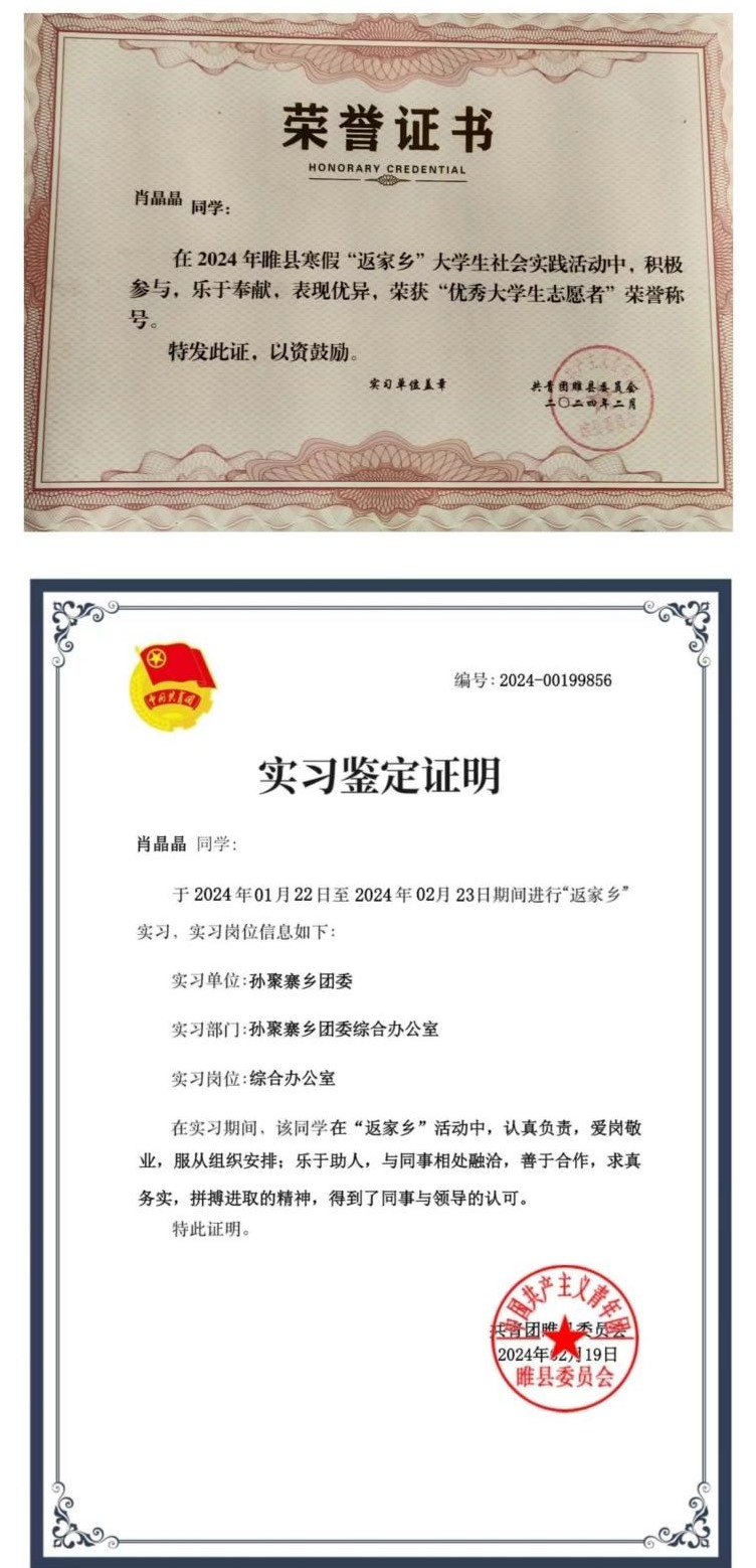 2023-2024学年寒假期间,基础部学子积极响应校部号召,纷纷投身于假期老员工社会实践活动,其中,2023级数学与应用数学专业本科一班的肖晶晶同学毅然投身于商丘市睢县2024年寒假“返家乡”老员工社会实践活动中,在此期间肖晶晶同学积极参与,乐于奉献,表现优异,获得了共青团睢县委员会颁发的荣誉证书和实习鉴定证明。