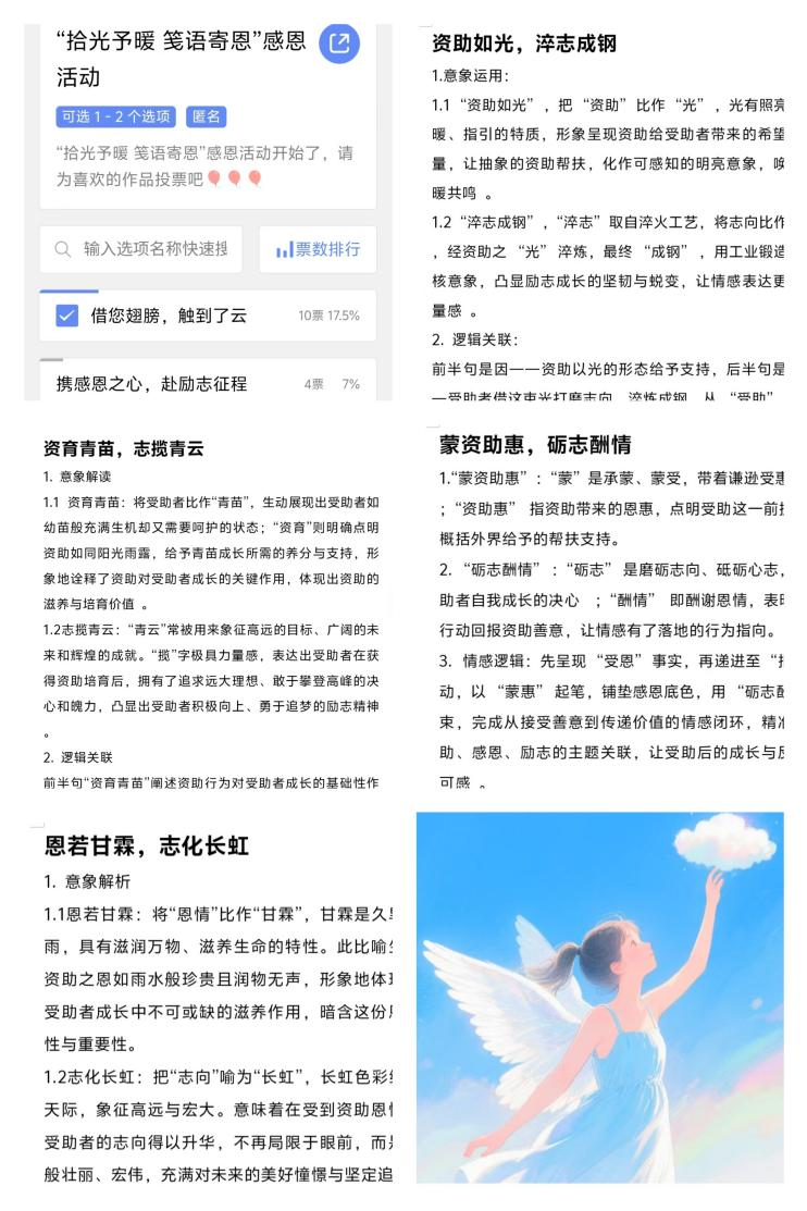 6月3日至6日,在线上“拾光予暖,笺语寄恩”感恩活动开展,组织员工用不超过10字的短句,围绕资助、感恩、励志等主题进行创作。“资助暖,梦扬帆”“感恩同行,不负韶华”等简洁有力的话语,凝练情感、传递谢意、唤醒温情,增进人际联结,锤炼文学功底,让感恩文化以直观形式传播,浸润校园角落。